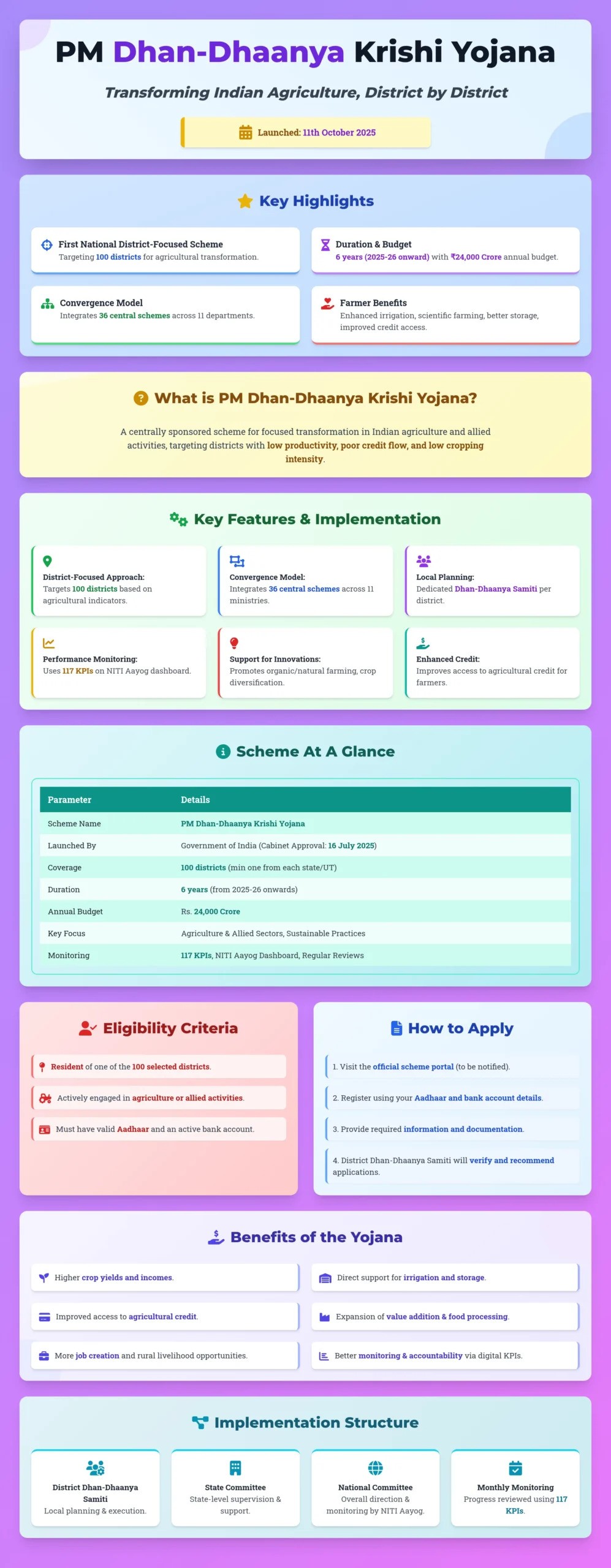 PM Dhan-Dhaanya Krishi Yojana is a centrally sponsored scheme designed to transformation Indian agriculture and allied activities. Under this scheme, those districts will be selected where there is low productivity, poor credit flow, and low cropping intensity. The scheme identifies 100 districts across the country for intensive agricultural reform and targeted assistance.